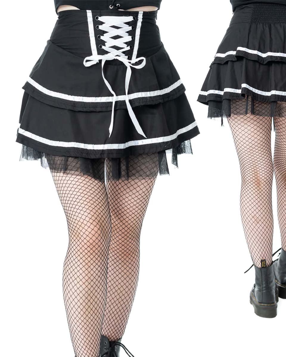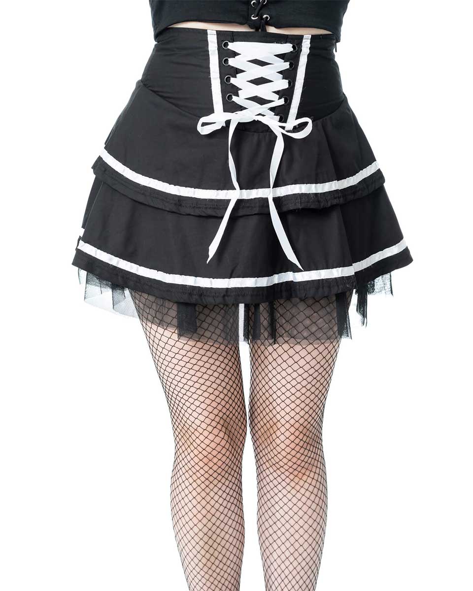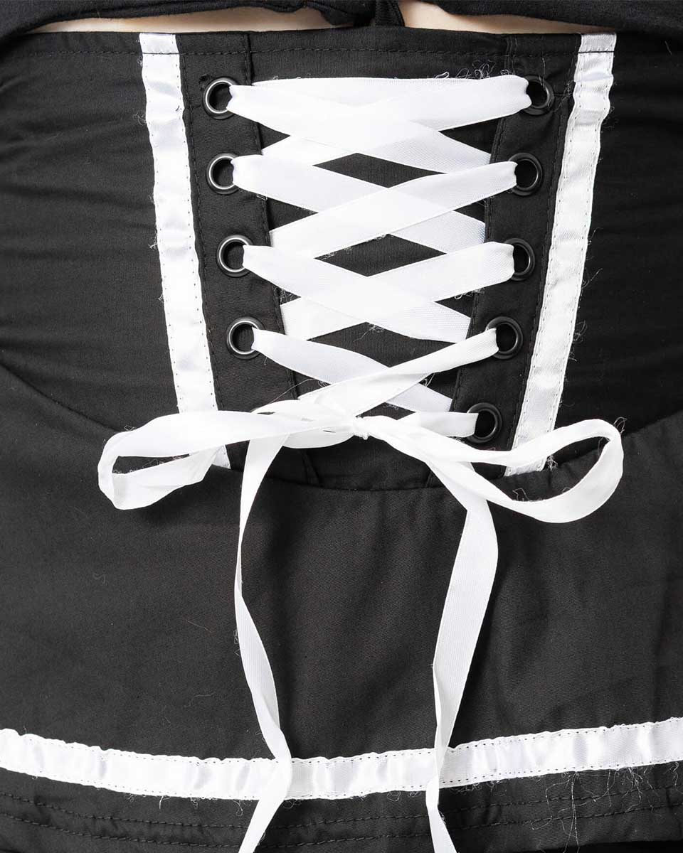 En kort svartvit kjol med snörning från Pozen industies.