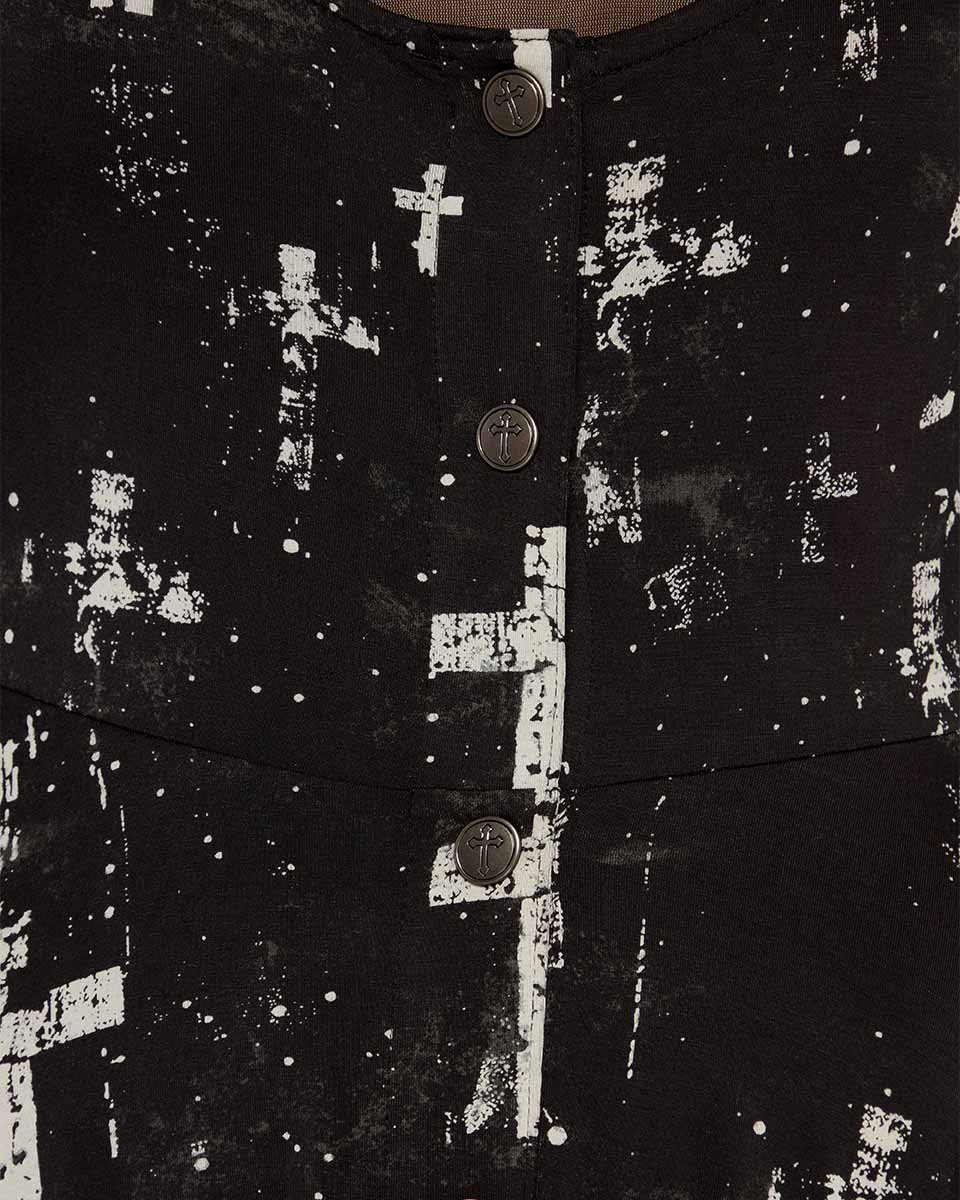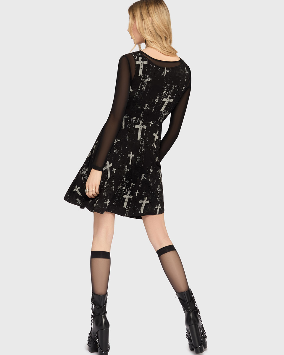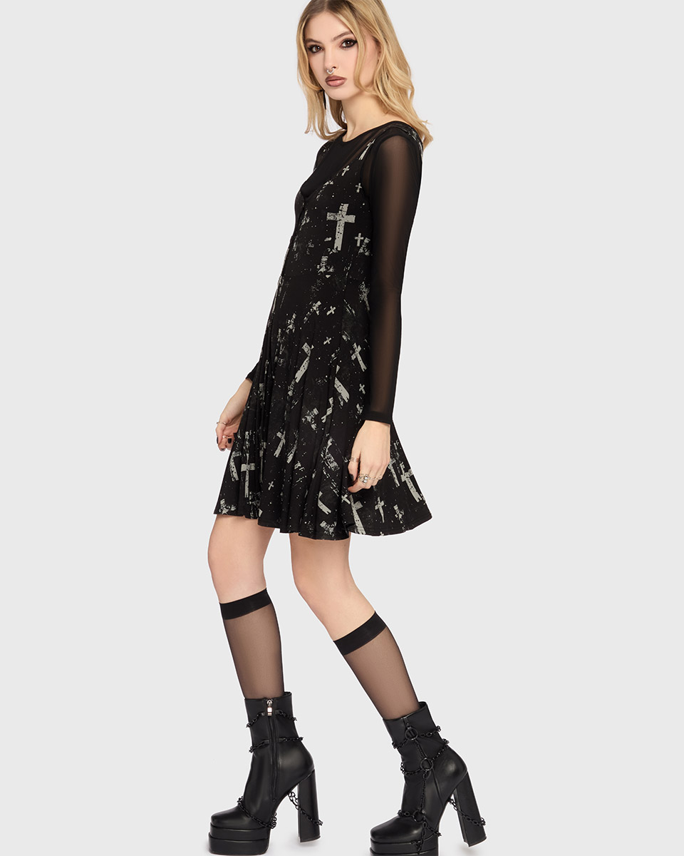 En svart klänning från Killstar med tryckta kors. Långärmade toppen under ingår ej.