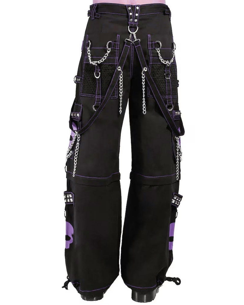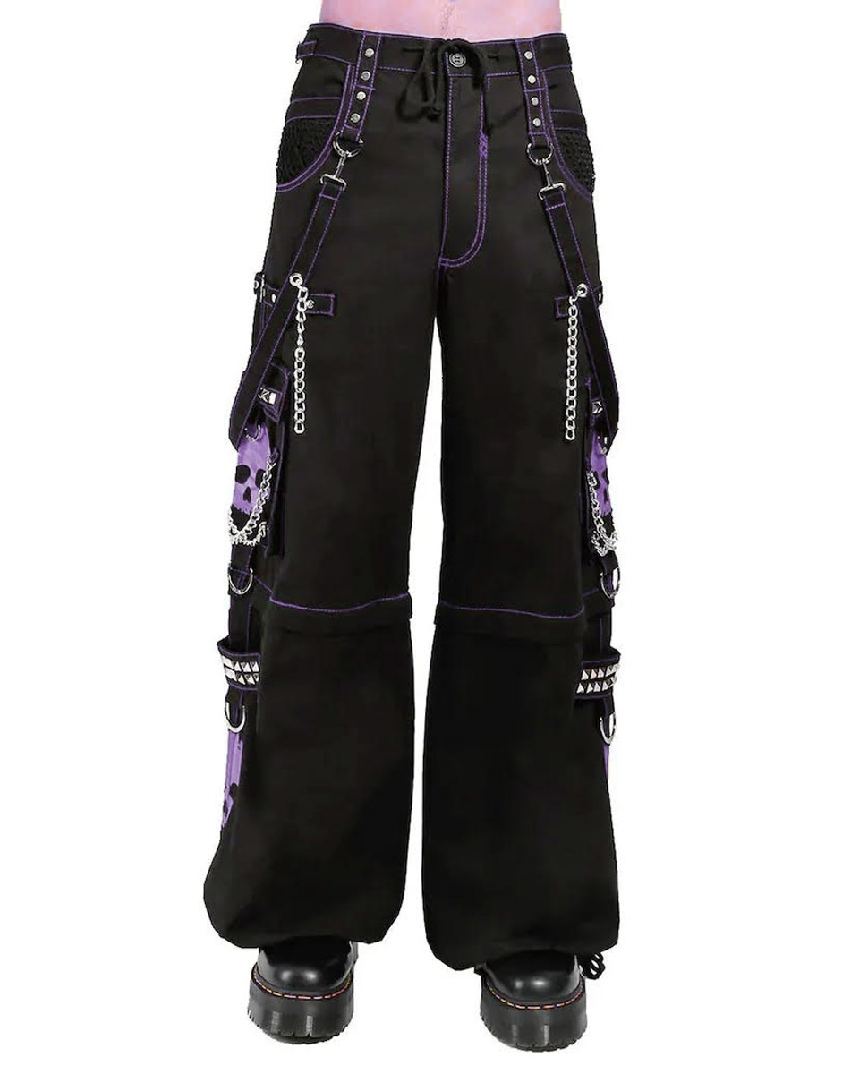 Ett par svarta byxor med lila sömmar, snygga detaljer och tryckta dödskallar.