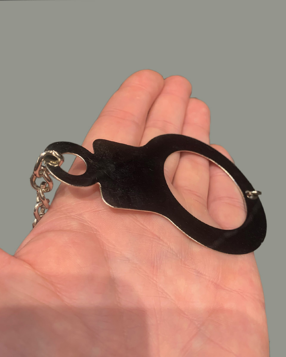 - Metalldetaljen som liknar handfängsel är helt platt, se bild!