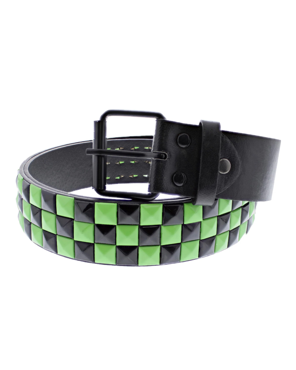 Treradigt svart vegan-läderbälte med små färgade svarta och gröna pyramidnitar.