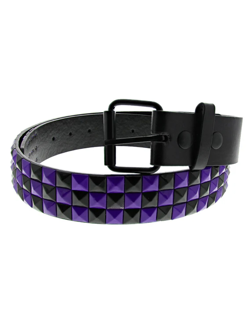 Treradigt svart vegan-läderbälte med små färgade svarta och lila pyramidnitar.
