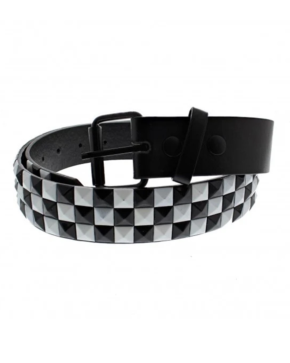 Treradigt svart vegan-läderbälte med små färgade svarta och vita pyramidnitar.